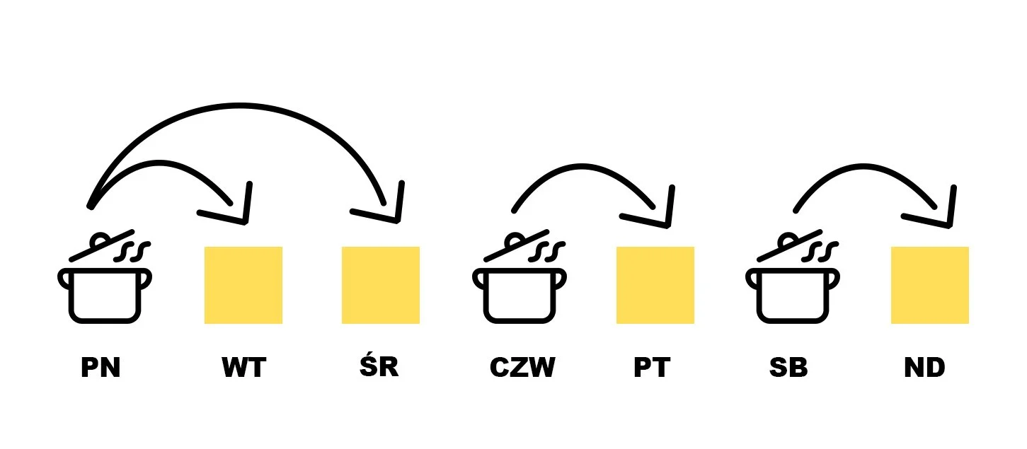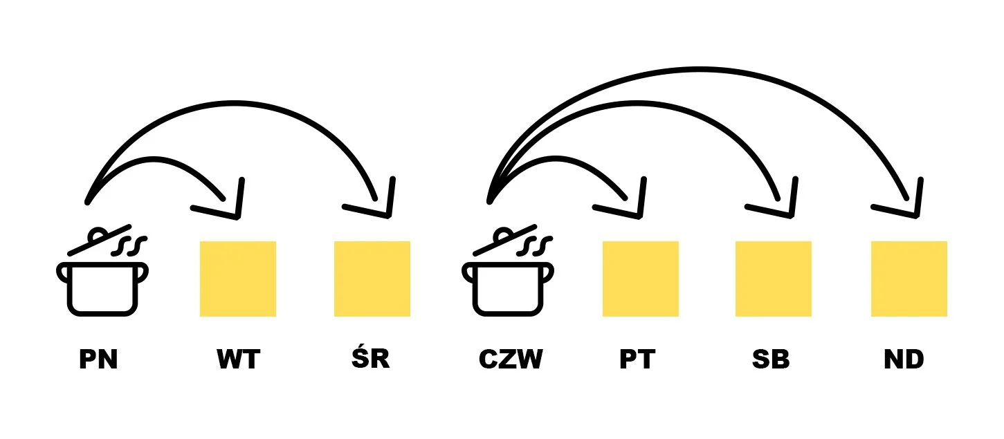 Zamiast codziennego "stania przy garach" - gotuj 2 lub 3 razy w tygodniu. Przygotuj posiłki na kilka dni, zapakuj do pudełek, schowaj do lodówki lub zamroź. Oszczędzasz czas i cieszysz się tygodniem bez myślenia o jedzeniu.